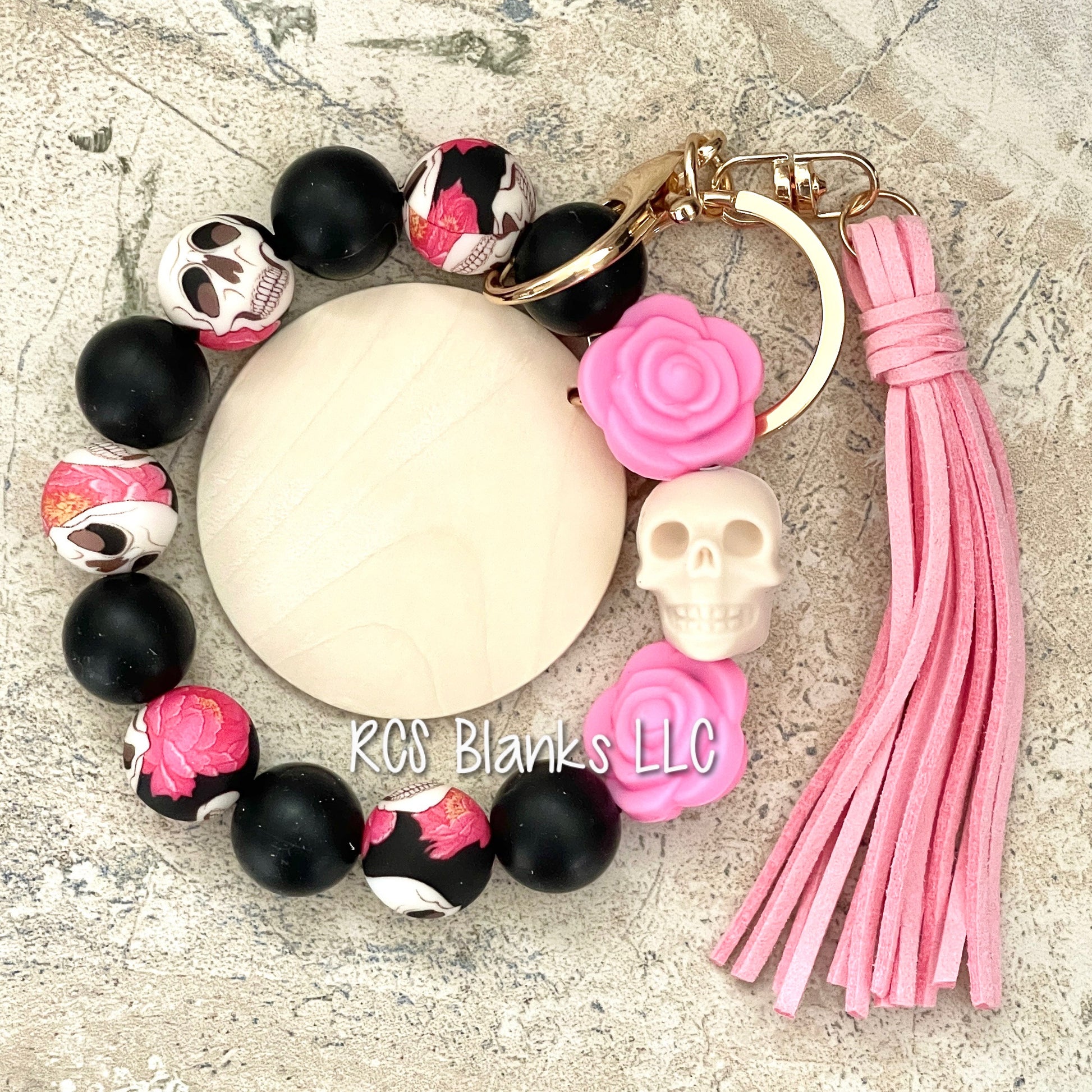 I'm dead! How about you? This bracelet is just fun! It shows exactly how all of us tired mothers feel. Dead! And surrounded by love with beautiful pink roses, round printed beads and a white skull. Accented with a pink tassel and round wood disc for personalization.