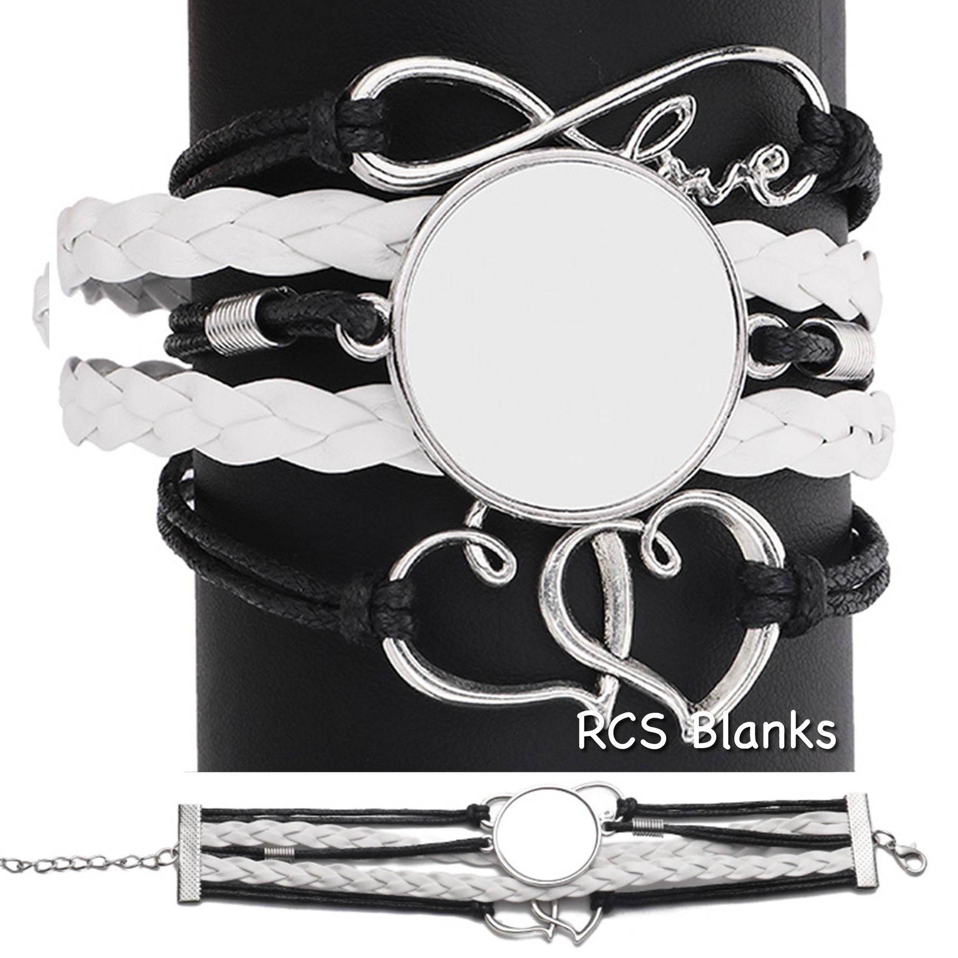 Beautiful black and white faux leather bracelet is accented with infinity love symbol and boule hearts. Sublimate your favorite design on the metal disc.