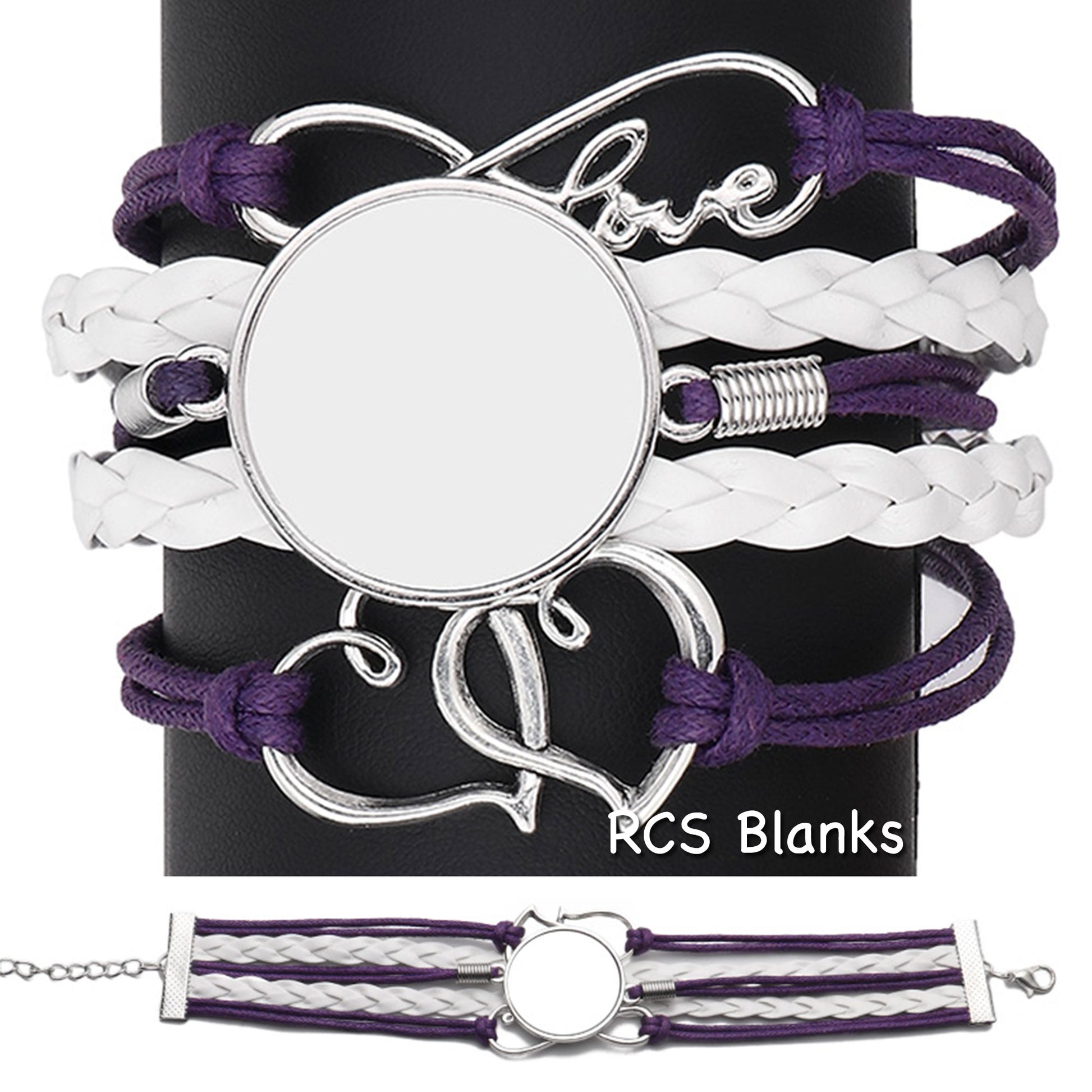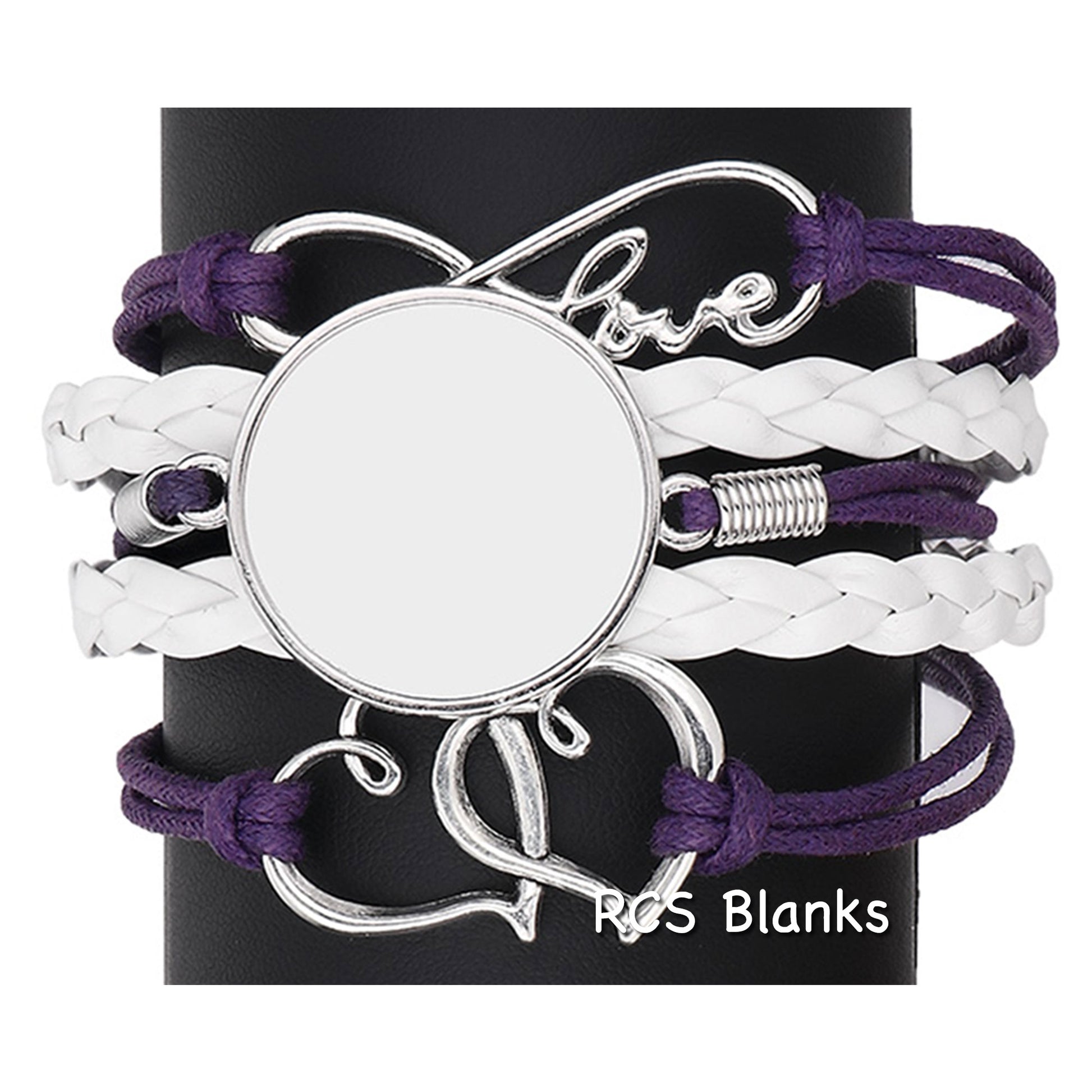 Beautiful purple and white faux leather bracelet is accented with infinity love symbol and boule hearts. Sublimate your favorite design on the metal disc.