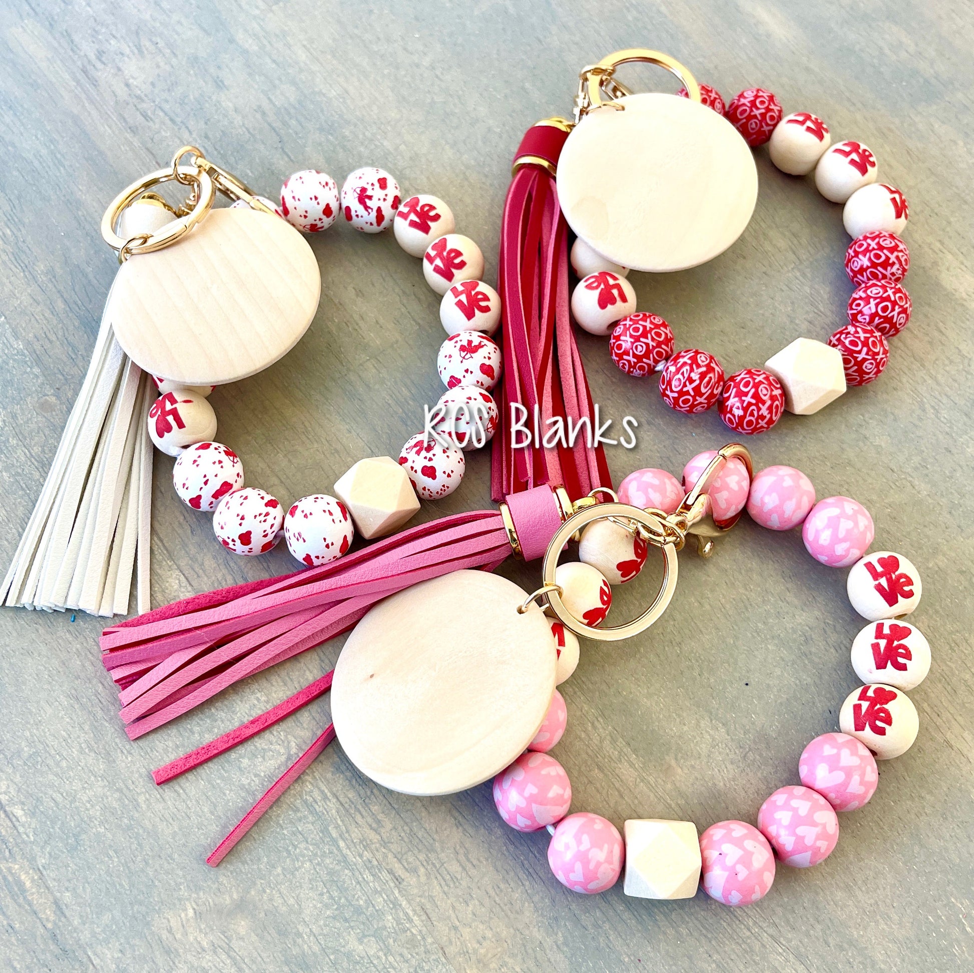 Add fun to your Valentine's Day with these super cute wood bead bracelets. Each one has a different design on the colored beads and are accented by natural wood beads with love in red. Complete with a natural wood disc for your personalization.
