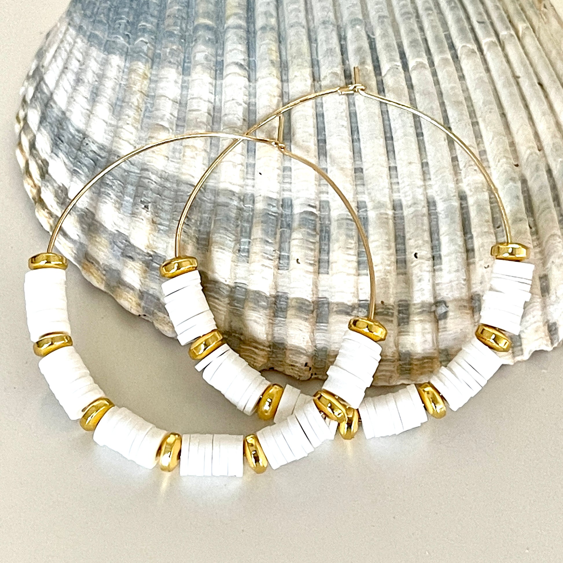 Our beaded hoop earrings are fun and classy with white heishi beads, gold accent beads on a gold wire hoop.